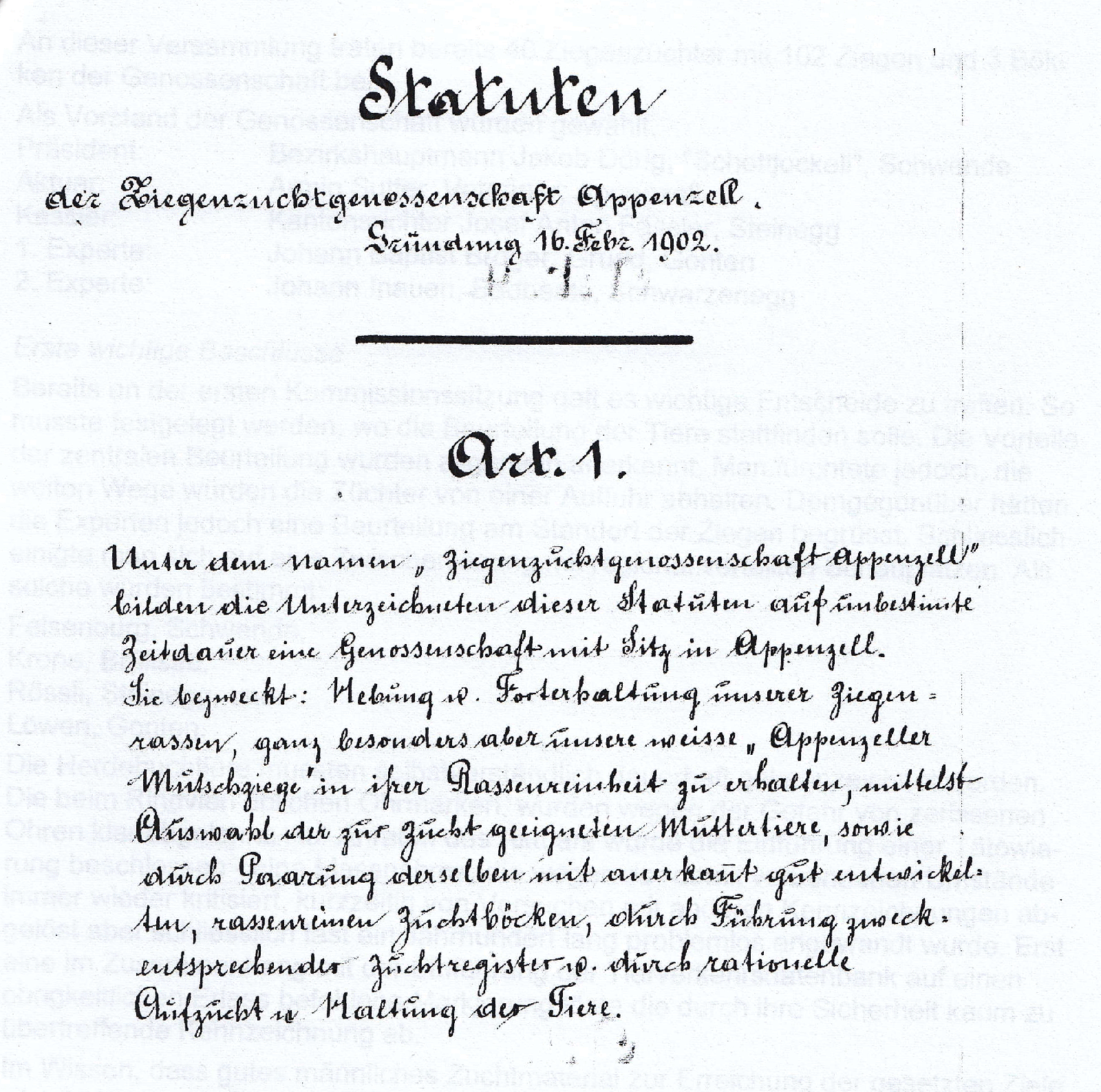 In den Statuten der Ziegenzuchtgenossenschaft Appenzell wurde als Ziel festgehalten, die weisse Appenzeller Mutschziege in ihrer Rassenreinheit zu erhalten. Dies sollte durch sorgfältige Auswahl geeigneter Muttertiere, den Einsatz anerkannter rassenreiner Zuchtböcke, die Führung zweckmässiger Zuchtregister sowie eine rationelle Aufzucht und Haltung der Tiere erreicht werden. Seit 1915 bestand für die Züchter die Möglichkeit, Ziegen an einer Schau vorzuführen und dafür eine Prämie zu erhalten. Im Jahr 1927 beteiligten sich Appenzeller Ziegenzüchter erstmals an der Milchleistungsprüfung. Diese zeigten deutlich, dass die weisse Appenzeller Ziege in ihrer Leistungsfähigkeit keiner anderen Ziegenrasse nachstand.