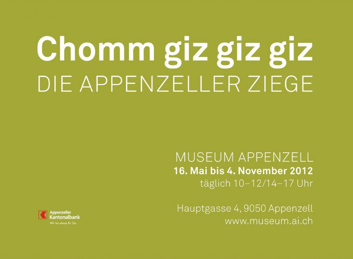 Das Museum Appenzell widmete der Appenzeller Ziege die Sonderausstellung «Chom giz giz giz. Die Appenzeller Ziege», die vom 16. Mai bis zum 4. November 2012 zu sehen war. Nachfolgend sind die Angaben des Museums wiedergegeben, welche Einblicke vermitteln, was die Besucherinnen und Besucher von dieser bemerkenswerten Ausstellung erwarten durften: