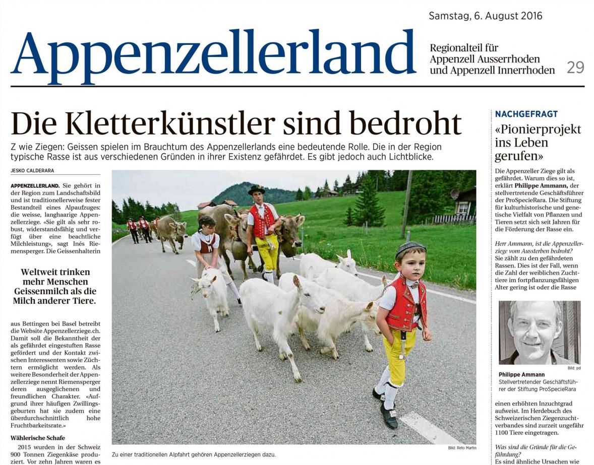 In der Folge nahmen sowohl die Haltungsbedingungen als auch die wirtschaftlichen Perspektiven ab, was zu einem markanten Rückgang der Tierzahlen führte. Im Jahr 1936 wurden nur noch 406 Appenzeller Ziegen gezählt. Dass sich die Rasse dennoch behaupten konnte, ist eng mit den kulturellen Traditionen des Appenzellerlands verbunden. Zur Alpfahrt gehören Appenzeller Ziegen bis heute. Noch immer wird der Alpaufzug im Appenzellerland von einem Knaben in Sennentracht angeführt, dem eine kleine Gruppe Appenzeller Ziegen folgt.