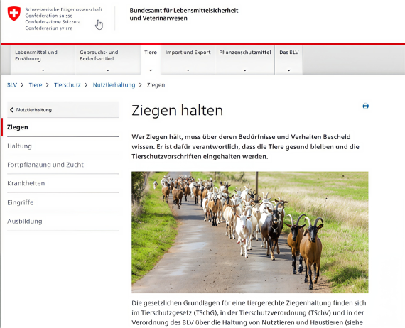 Sie suchen Informationen zur tiergerechten Haltung von Ziegen? Das Bundesamt für Lebensmittelsicherheit und Veterinärwesen (BLV) informiert auf seiner Website über die geltenden Vorschriften, unter anderem zu Stallflächen, Auslauf, Fütterungund Betreuung. Zudem finden sich dort weiterführende Praxisempfehlungen und rechtliche Grundlagen zur Ziegenhaltung.