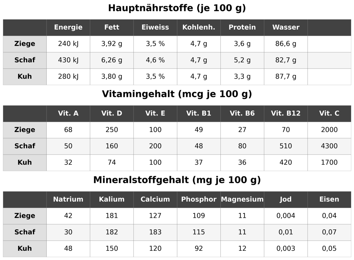 In der Literatur finden sich daher unterschiedliche Angaben. Die nebenstehenden Daten wurden zusammengestellt aus Angaben bei www.oekolandbau.de sowie Brigitte Kengerter: «Die Bedeutung von Ziegenmilch für die menschliche Ernährung», Schriftenreihe des Arbeitskreises für Ernährungsforschung, Band 1, 2003.